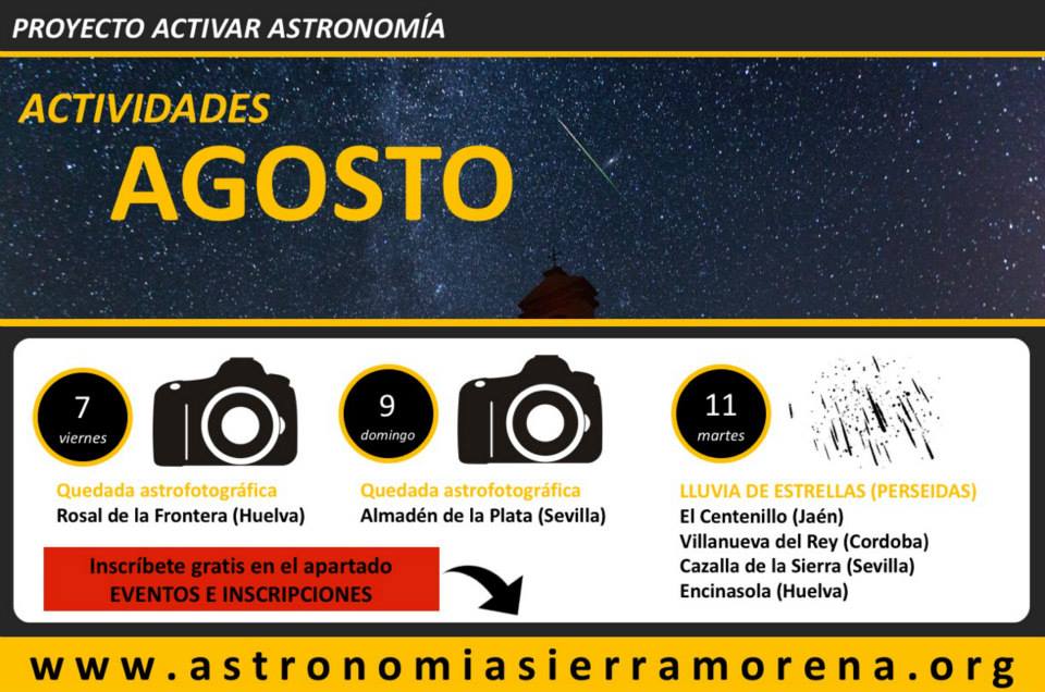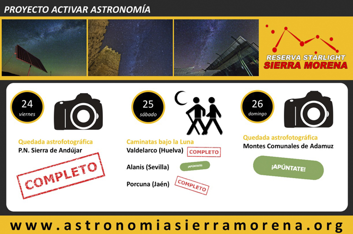 - El viernes día 24 comenzamos esta peculiar maratón con una quedada astrofotográfica en el Parque Natural de la Sierra de Andújar (Jaén). El punto de encuentro es el Centro de Visitantes de las Viñas de Peñallana. - El sábado 25 tendrá lugar la tercera ronda de caminatas bajo la Luna, en esta ocasión estaremos en las localidades de Valdelarco (Huelva), Alanis (Sevilla) y Porcuna (Jaén). La de Villaharta (Córdoba) tendrá lugar el miércoles día 29. - El domingo acabamos con una quedada astrofotográfica en los montes comunales de Adamuz (Córdoba).