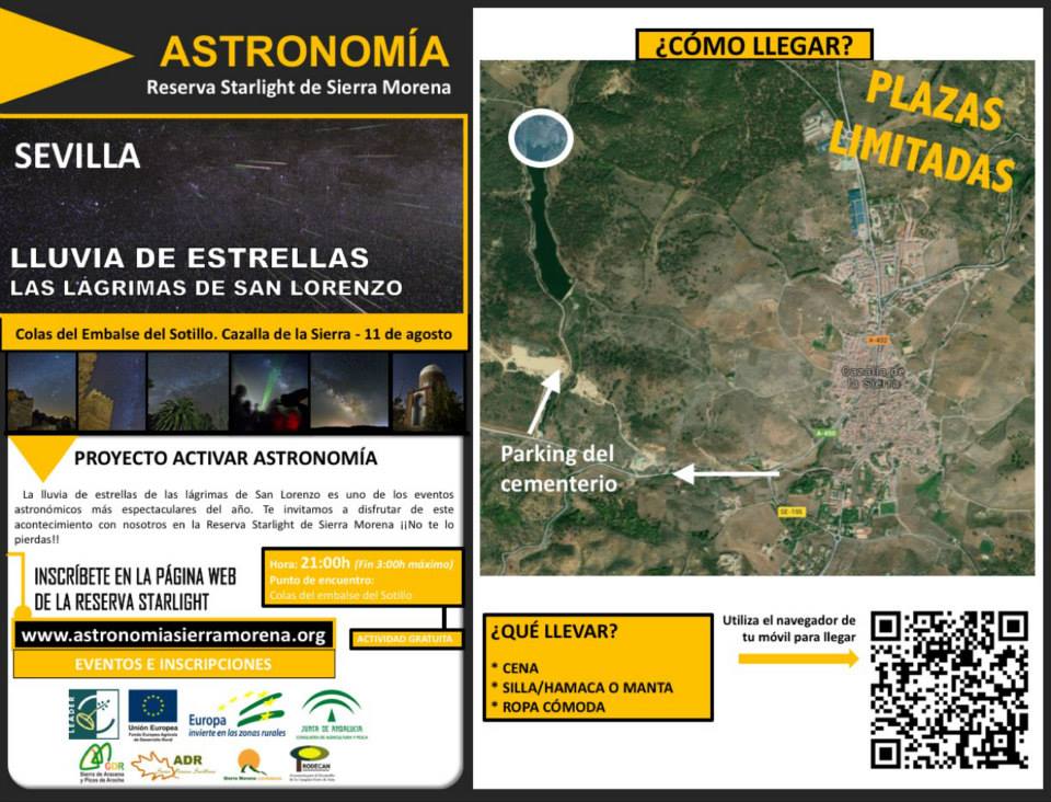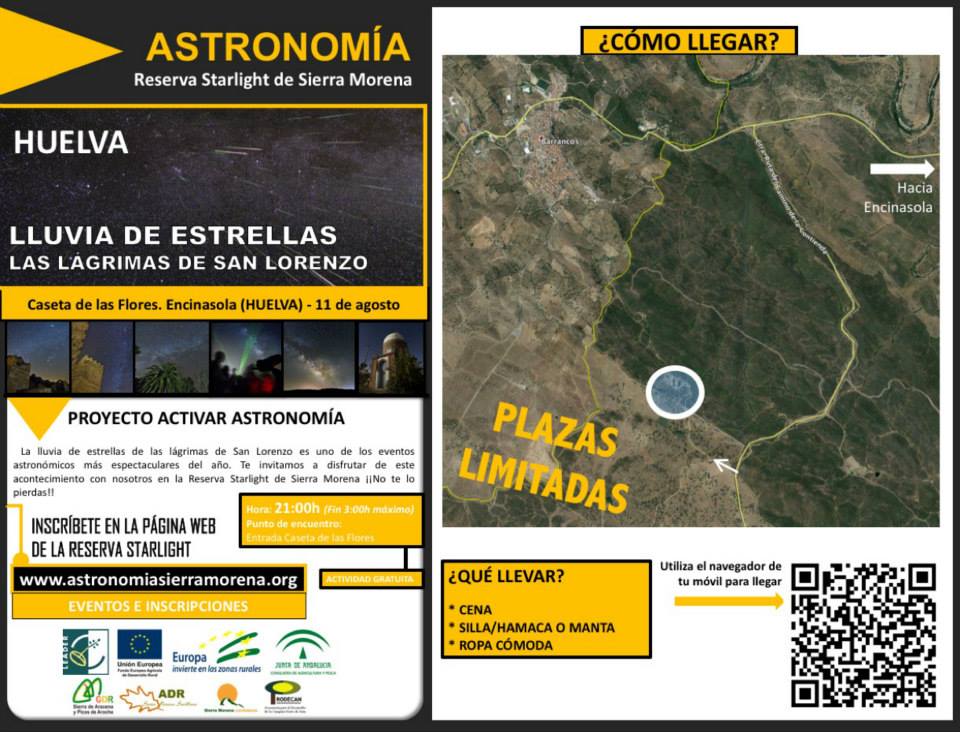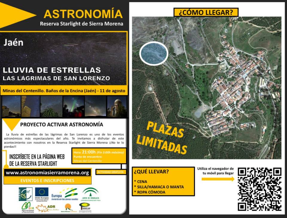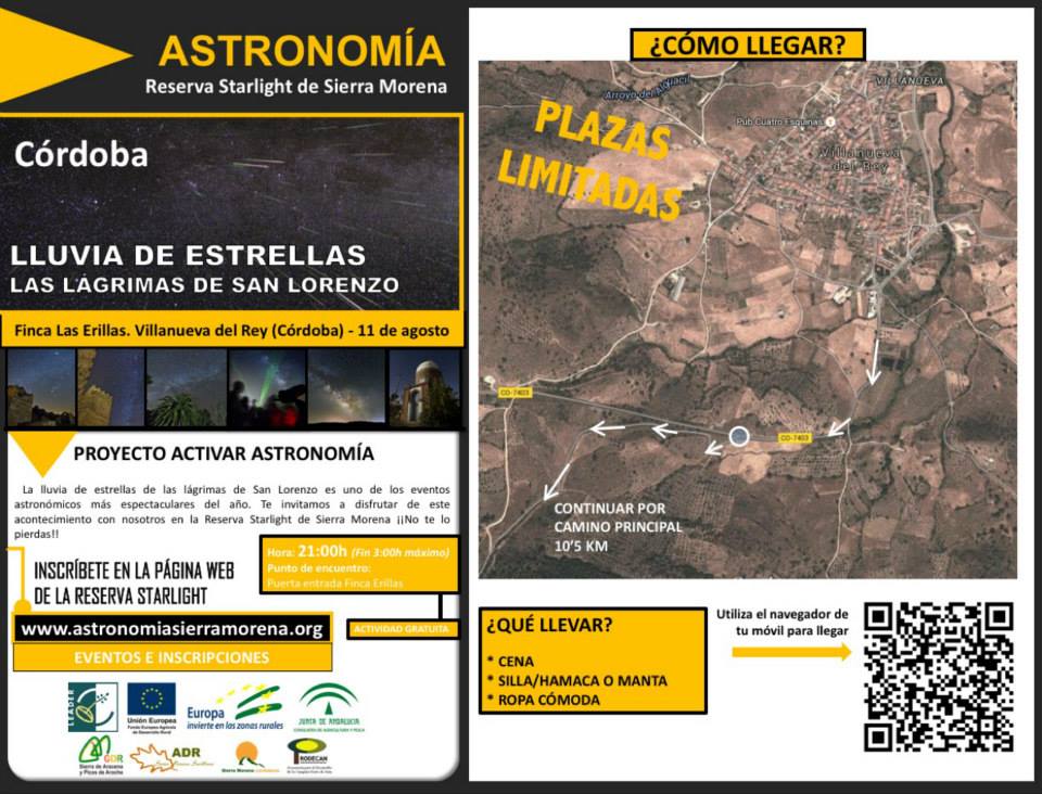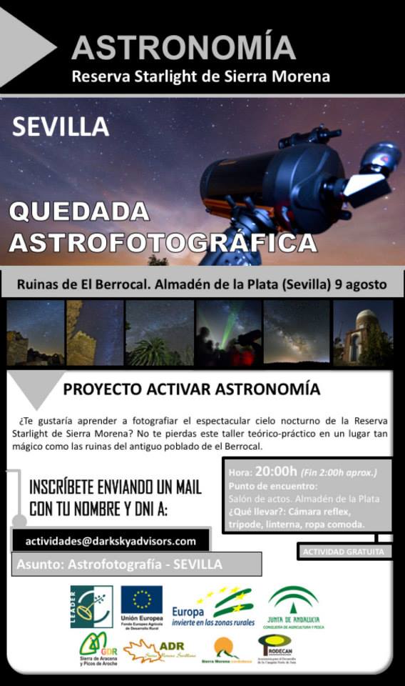 La acogida de estas actividades ha sido magnífica y quedan muy pocas plazas. Gracias a todos/as por vuestro interés. Os invitamos a seguir atentos a nuestros perfiles sociales para estar al corriente de las siguientes actividades. Recuerda: Facebook: Reserva Starlight Sierra Morena Twitter: @SMAstronomia Aun estás a tiempo de inscribirte en las que queda sitio a través de actividades@darkskyadvisors.com indicando nombre completo, DNI y la actividad a la que quieres ir.