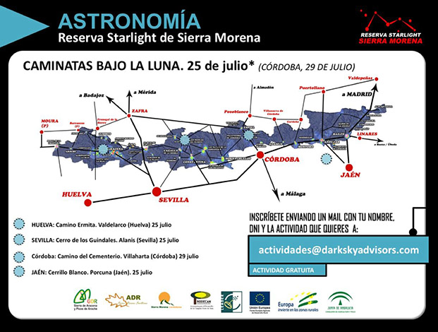 Durante los dias 25 y 29 de julio celebraremos la tercera ronda de caminatas bajo la Luna en la Reserva Starlight de Sierra Morena.Las localidades para esta ocasion son:<>